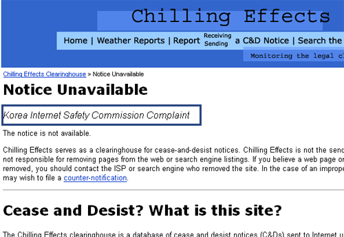 이와는 별도로 한국 정부는 법률에 위반되는 웹사이트를 자의적으로 해석, 각각의 검색엔진에서 관련 내용을 삭제토록 하고 있고, 구글과도 이를 공유하기 시작했다. 이에 구글은 미국에서 제공하는 서비스인 칠링 이펙트라는 반검열 비영리 단체의 링크를 한국 검색엔진에서 제공하고 있다.